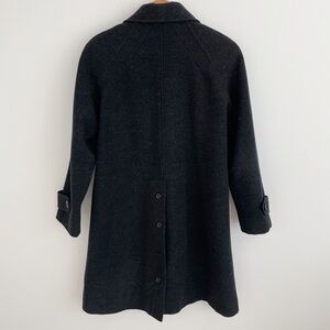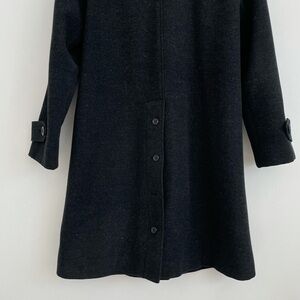 Vintage Harve Benard 100% Wool Black Long Sleeves Button Down Long Jacket. Beautiful vintage 100% Wool. Long sleeves. Button down closure. Slit on the back with button closure. Removable collar straps. Two side pockets. Button closure on the cuffs (sleeves).