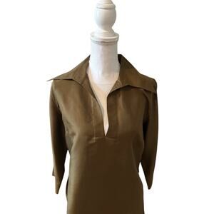 Vintage Harve Silk Collared Top Olive Green, size 12. Very good preowned condition, 100% textured duponi silk with collar, v neck and cropped sleeves.