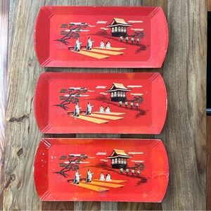 Vintage Hasko wood veneer lap trays red Asian scene MCM 50s set of 3