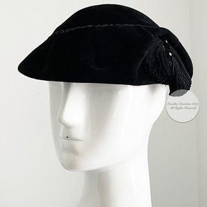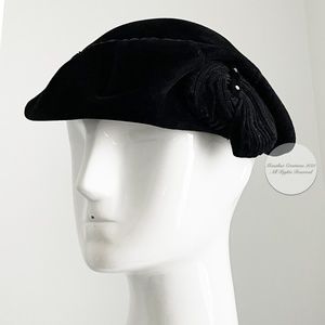Vintage black fascinator style hat or clouchette cap with floral embellishment, likely made in the 60s. Label reads GENUINE IMPORTED VELOUR with an Eiffel Tower logo; the hat is stamped MADE IN FRANCE. Preowned/vintage with some signs of use & wear: some light rubs to velour; would benefit from steaming & reshaping. No size tag. Measurements (appx): inner crown - 22.5in/outer crown - 23.5in.