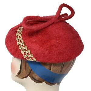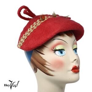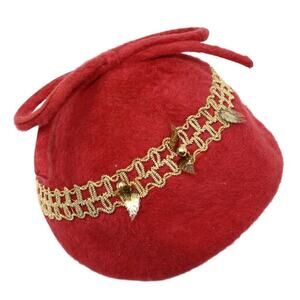Vintage Hat Red Cascasine Fur w Metallic Trim and Big Bow