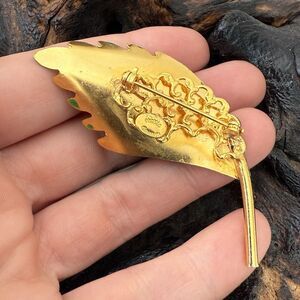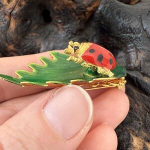 Whimsical red lady bug on a green enamel leaf brooch with gold tone detail. It is marked on the underside in an oval. The piece is in very good vintage condition. See pictures for better detail as well as measurements.