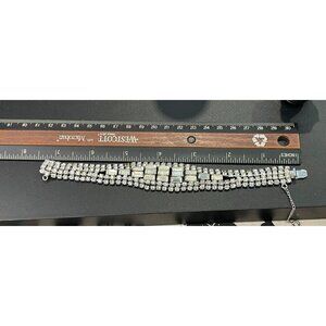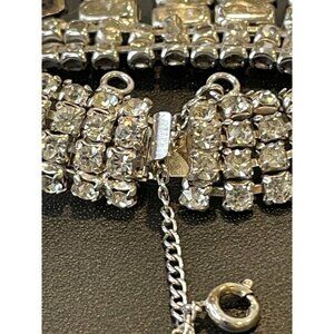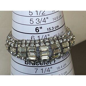 This exquisite bracelet showcases Hattie Carnegie's signature sophistication. Adorned with sparkling rhinestones, its baguette and round-cut stones reflect timeless elegance. The safety chain ensures a secure fit, making it an ideal piece for those who appreciate vintage luxury. A stunning statement accessory from a distinguished designer.