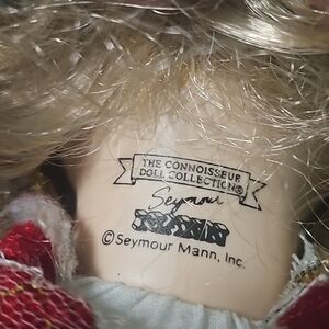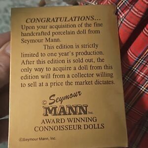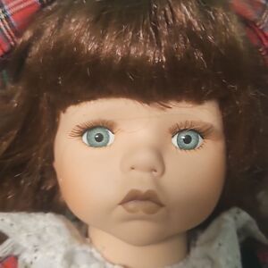 3 vintage Seymour Mann Connoisseur Collection and Limited Edition porcelain dolls with stands. Christi is 17" tall and wearing Tartan red plaid dress with a bowbrobrown hair and handpainted sour puss face.