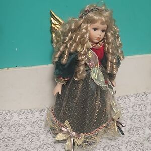 Save the Children vintage 1997 fairy godmother doll with gold wings and kind tender loving energy. Her spirit is Dalia and feels the most empathetic of the trio. Rachel's vessel is a 1992 Connoisseur Collection Seymour Mann doll with Wavy blonde hair and ribbons on her blue Victorian dress that match her hair. She is friendly and childlike with playful fun energy.