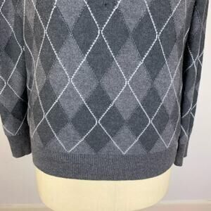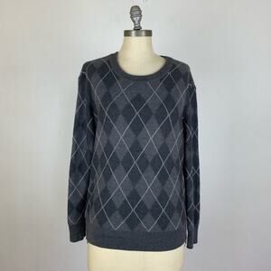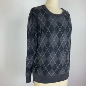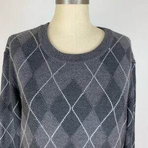 Stylish gray argyle sweater. Crew neck design. Perfect for layering.