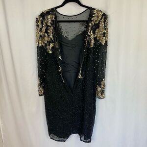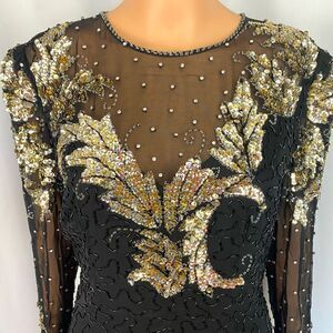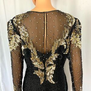 Vintage 80s Haute black sheer silk cocktail dress with Silver& gold sequins, rhinestones, black beads, knee length gown, Long sleeve semi sheer. heavily bead/sequin covered silk shell, poly/acetate lined. Hidden back zipper, sheer bodice, back keyhole, back vent slit.