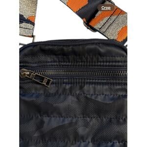 Vintage Havana Crossbody Bag. It features a camouflage pattern in shades of gray and navy, a zip closure, and an adjustable, patterned shoulder strap in orange, gray, and navy The bag also has a small zip pocket on the front and a soft fabric lining inside. It is made of luxurious materials and has a spacious interior.