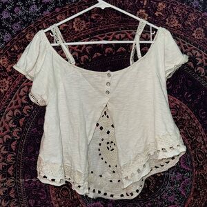 Boutique top from Vintage Havana in a soft cream hue. Embellished with intricate cut-out details, it offers a stylish and airy look perfect for warm weather. Intricate and styled with an open back and pearlescent buttons.