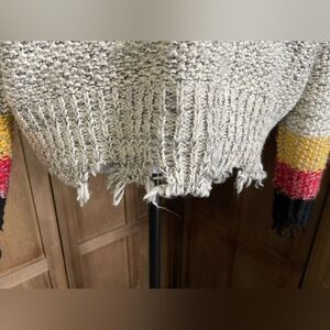 Vintage Havana V-neck Frayed Distressed Sweater. Light gray with black, red and yellow stripes.