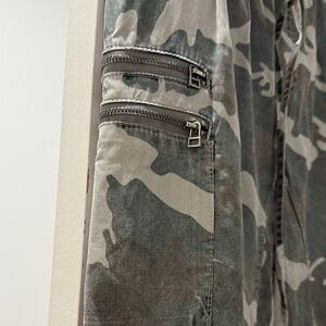 Stylish cargo pants with a camouflage pattern. Features multiple pockets and elastic cuffs with a distressed look.