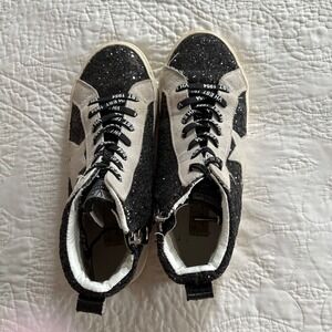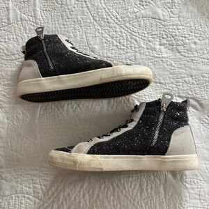 These high-top sneakers showcase a dazzling black glitter finish complemented by a contrasting star patch, offering a blend of edginess and elegance. The off-white sole adds a touch of vintage appeal, making these sneakers a standout piece in any wardrobe. Perfect for adding some sparkle to a casual brunch outfit, elevating your street style look, or making a statement at a concert. Please see photos for details. Still lots of life left!