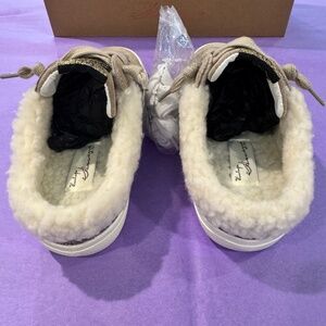 Tan sneakers with glitter and pink star accents. Slip on mules with shearling lining. Comes with an extra set of white shoe laces.