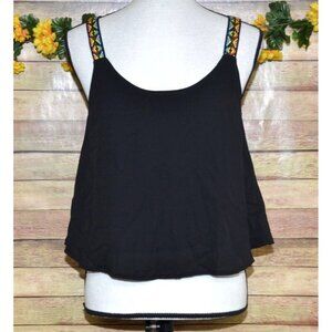 This Vintage Havana sheer black cropped tank top features embroidered Southwest Aztec design straps. It's lightweight and flowy, perfect for casual outings and keeping cool during warmer days.
