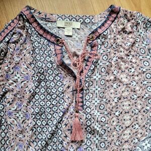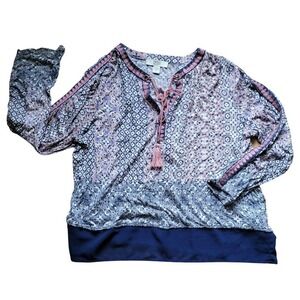 Vintage Havana Navy Blue And Pink Bohemian Printed Blouse Size Medium Tie Neck
