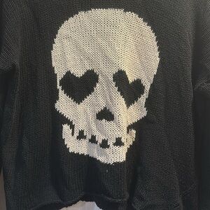 Gently worn Vintage Havana Oversized Loose Knit Off Shoulder Skull Sweater women's size medium. Loose sweater knit, light distressing, wide off shoulder neckline, long sleeves with stitched cuffs, large cream skull skeleton with heart eyes on front. Great for Halloween! Offers accepted!