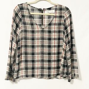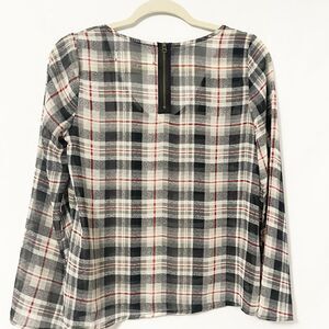 Semi sheer, unlined, oversized, V Neck, plaid, loose fit, back zipper closure. Excellent preowned condition, no rips stains or tears. Measurements laying down