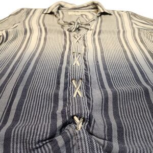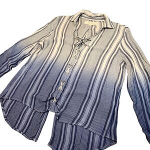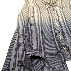 Vintage Havana Ombre Lace Up Top Blue White Stripe Soft Brushed Lightweight Cotton Flannel Feel Oversized Slouchy Long Sleeve