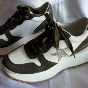 Trendy and super comfortable Vintage Havana VH EST 1954 sneakers in a stylish olive green and white color combo with a signature silver glitter star accent. These fashion-forward sneakers feature a soft suede and leather upper, chunky platform sole, and a touch of sparkle that makes any outfit pop.