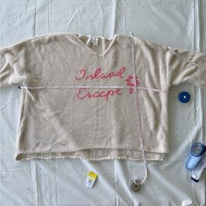 Stylish V-neck sweater by Vintage Havana. Cream knit with pink script design. Ideal for casual wear. See photos for measurements . Thanks!