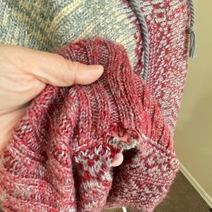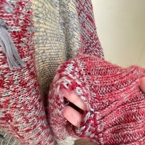 Great knit poncho to add to your wardrobe this fall! Hooded with a working drawstring. Large red and cream block stripe with grey-blue knit detail work.