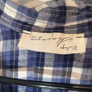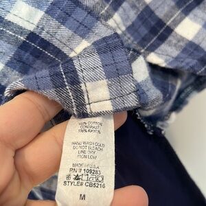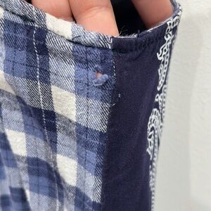 front blue flannel // rear navy white bandanna print preowned - discoloration on tag/ stitched upside down, small hole needs mend, under arm