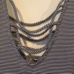 Worn a few times, still in great condition. Cute summer top. The front is criss cross on the chest (shown in photo) but you can wear it backwards too and just have 2 stripes across.
