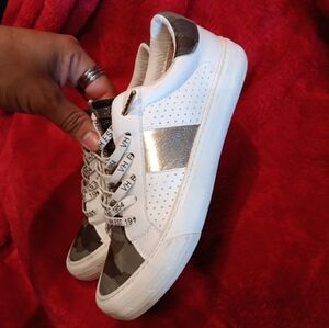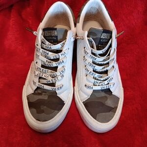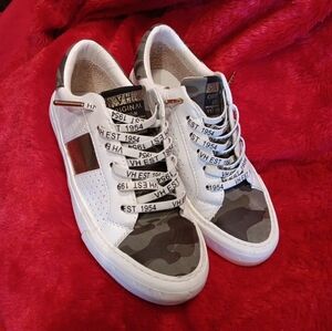 Stylish white sneakers with camouflage accents. Features unique text design on laces.
