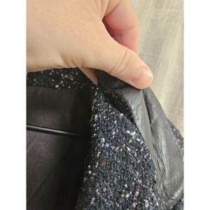 Leather collared black tweed jacket with rolled sweater cuffs, single double breast button closure,zand front pockets. Has shoulder pads and a total Molly Ringwald Breakfast Club vibe! Fully lined. Great vintage condition, though there is a rip along the seam where the Leather collar meets the tweed.