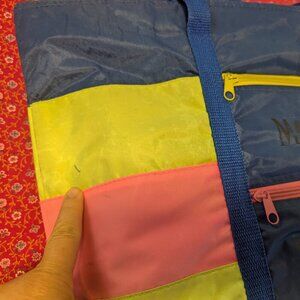 Extra large bag zip at top and has multiple smaller zippered pockets on the sides. Double sided with different Hawaiian islands listed on the bag: Molokai Oahu Maui Hawaii Lanai Kauai
