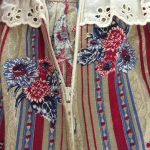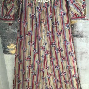 This is Vintage 1980 traditional Hawaiian Muumuu for Aloha Friday dress. It Is in pristine condition. It is a long maxi , flowy ruffle bottom with puff slit tie sleeves. Yoke is detailed with lace and ribbon edging. It is a beautiful Hawaiian flower/stripe print of red, white and blue on a beige back ground. It is made by one of the popular Island designers "LOLA" Purchased in old Lahaina town boutique in the 80's. Size Small