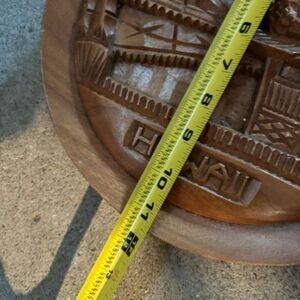 Vintage Hawaii Monkey Pod Wooden Tiki Plate. 11 3/4”, has a crack across the top, may have been repaired. W13