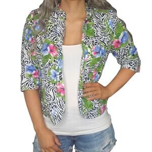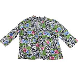 Absolutely beautiful lightweight and comfortable cardigan by Choices in a womens petite large. Unique black and white animal print design with bright and vibrant hibiscus flowers. 100% linen. Has shoulder pads. No rips stains or tears, but front opening could use a little ironing to lay back flat.
