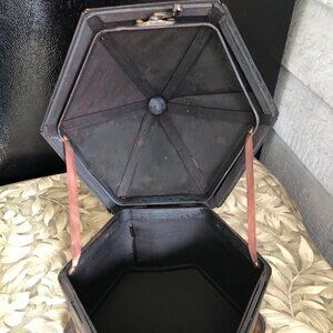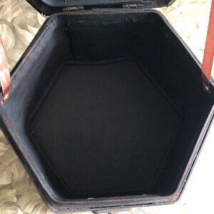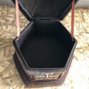 The basket has an attached hexagonal shaped lid and a brass hook loop closure and a brass ring for hanging option. A medium-sized storage or jewelry box, It is in perfect condition with no breaks. A Rustic beauty storage box perfect for all occasions. Was a gift given to my mom in Hawaii in early 80's. Approximate 12" height.