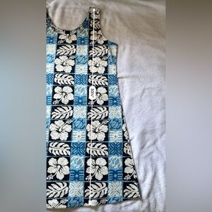 Vintage Hawaiian Hibiscus Floral Shift Dress Blue White Cotton Size L