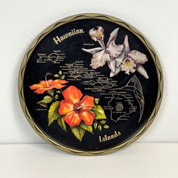 Vintage Hawaiian Islands Travel Souvenir Black Serving Tray Mid-century