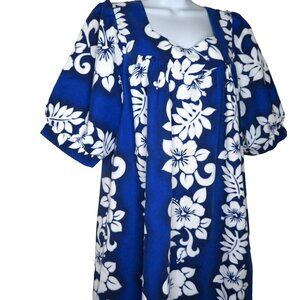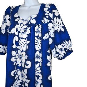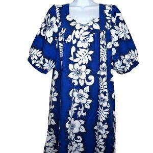 Vintage Hawaiian Maxi Muumuu Aloha Dress Womens L Blue Hibiscus Short Sleeve