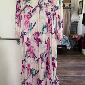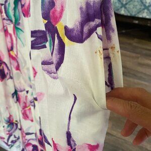Preowned vintage women’s white with flowers Mu'umu'u dress with ruffled puff designs throughout, pockets, and buttons on front. Three quarter sleeves. Also has subtle Hawaiian print.