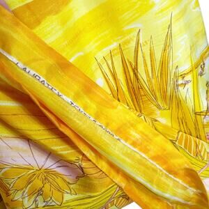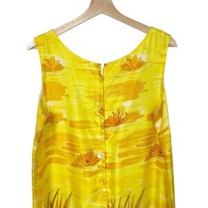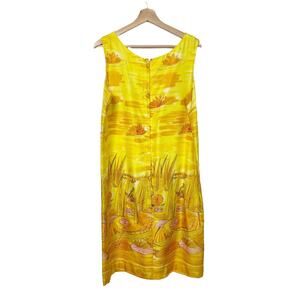 This stunning vintage Hawaiian print dress features a bright yellow background with vibrant floral patterns, including lotus flowers and scenic illustrations of people in traditional attire