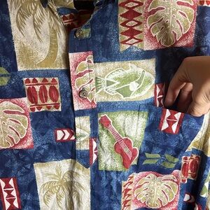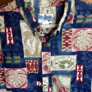 Vintage Hawaiian Shirt Cotton Collar Button Palm Tree Guitar Fish Short Sleeve