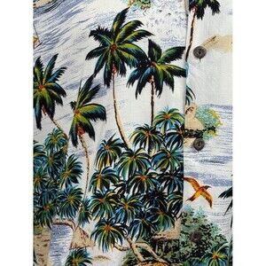 Vintage Y2K Ocean Current Hawaiian shirt from the early 2000s. Made in Korea from 100% rayon with a bold tropical beach print featuring palm trees, birds, and ocean scenes. Classic Aloha vibe with soft, breezy fabric and a relaxed drape. A true vintage surf-style piece - perfect for collectors, summer events, or anyone into Y2K and early 2000s fashion.