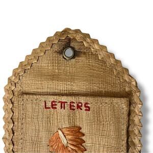 Vintage, circa 1970s Mid Century Modern area, Hawaiian Wall Mail Organizer. Handcrafted wall organizer with floral embroidery. Features sections for letters, bills, and miscellaneous items. Perfect for adding a retro tropical touch to your home.