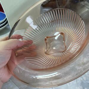 Vintage Hazel Atlas 8.5” pink depression glass “Rest-Well” mixing bowl ribbed he
