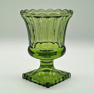 Lovely vintage green glass footed dish from Hazel Atlas with slightly flared, scallop sides and square base.