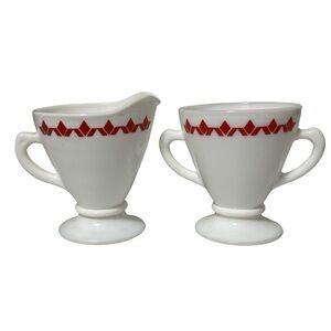 Vintage Hazel Atlas Milk Glass Footed Sugar and Creamer Set Red Diamond Tulips