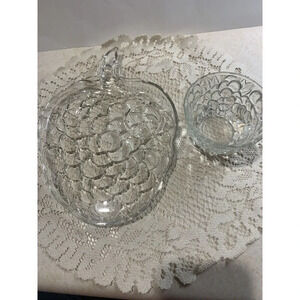 This vintage Hazel-Atlas glassware set is a stunning addition to any collection. The two-piece set includes a plate and cup, both featuring a beautiful orchard crystal pattern. The clear crystal glass and molded grapes style give a touch of elegance to any table setting.