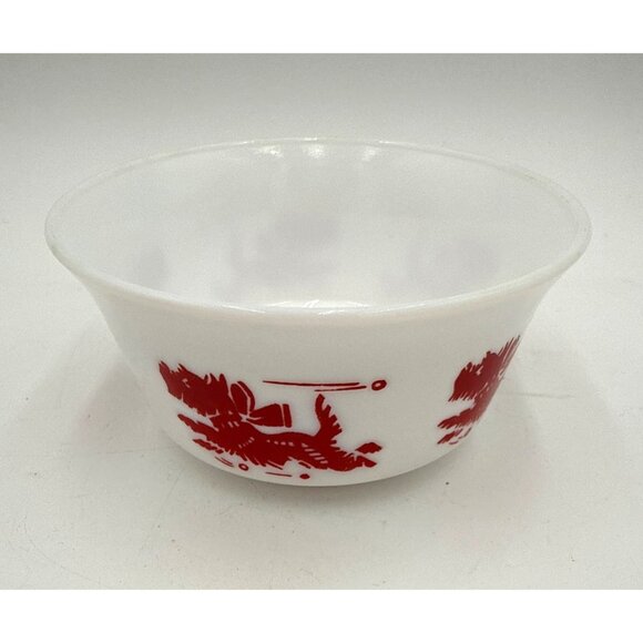 This collectible Hazel-Atlas Kiddie Ware bowl features a charming red Scottie Dog parade on durable milk glass. Ideal for adding a nostalgic touch to your kitchen or dining set.