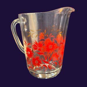 Vintage Hazel Atlas Red & Gold Floral Glass Serving Pitcher Mid-Century 1950s