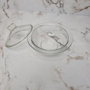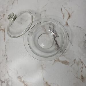 Vintage small clear bowl with lid. Has HA on the bottom for hazel Atlas. Makes a cute candy dish.
