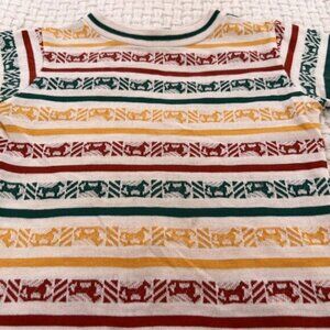 Adorable vintage tee in cream, mustard, pine green, and maroon red. Repetitive motif of stripes and rocking horses. GUC but very good vintage - a small stain and undone stitching on the bottom.